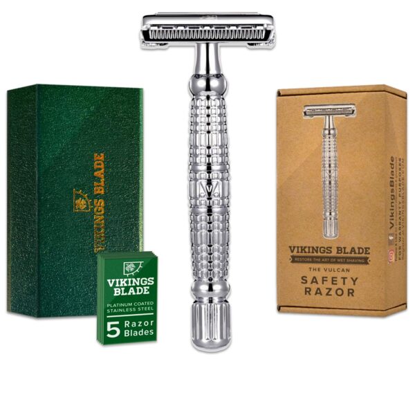 VIKINGS BLADE Double Edge Safety Razor for Men + 5 Swedish Steel Blades + Luxury Case. Long Handle. Smooth, Reusable, Eco-Friendly (The Vulcan)
